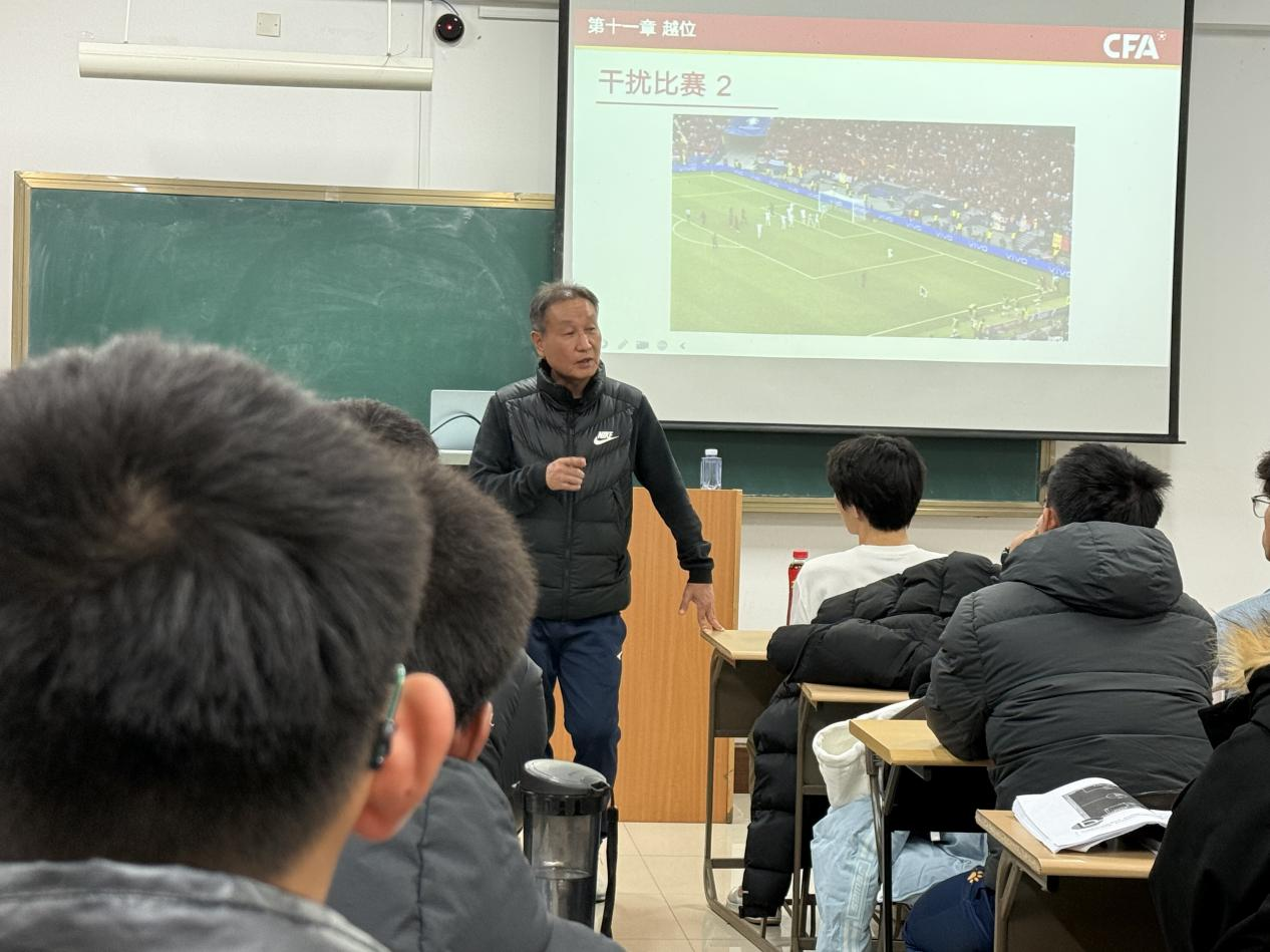 线上课程中,任通老师以足球竞赛规则为核心,结合典型判罚案例解析,深入浅出讲授裁判职业素养与判罚逻辑;线下实操环节,韩希文老师凭借数十年执法经验,逐项示范停哨、黄牌判罚等规范手势,并通过模拟比赛突发场景,指导新生灵活运用判罚技巧。