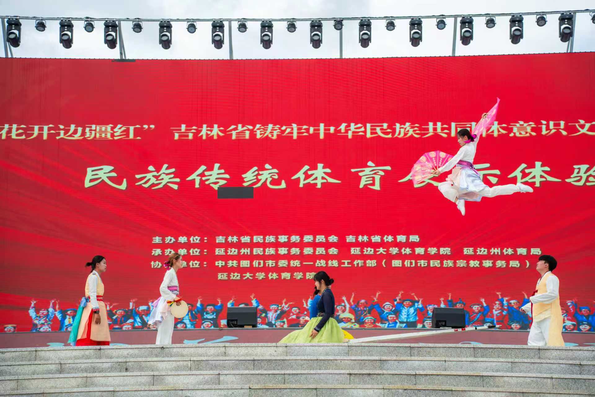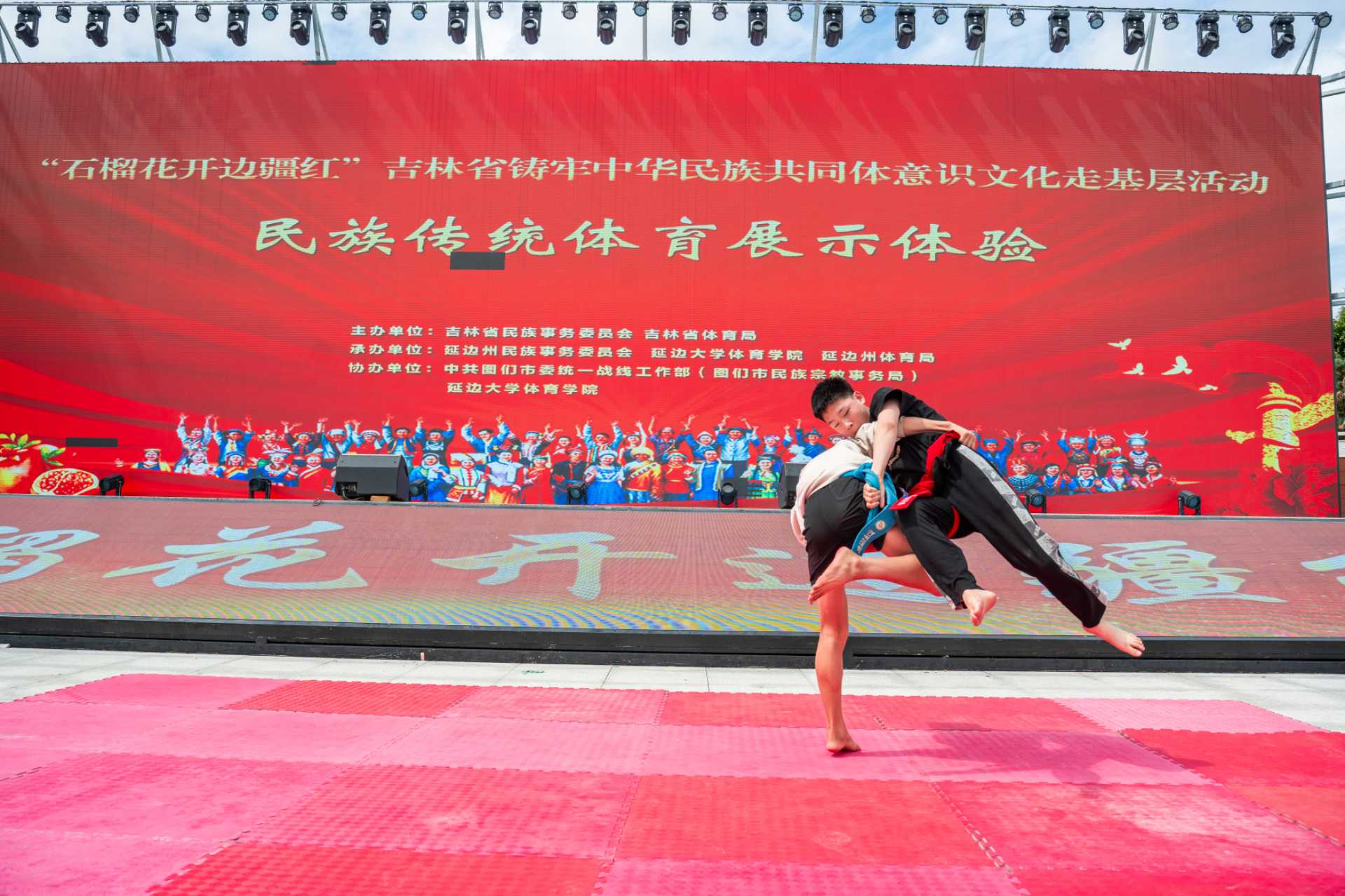 为深入贯彻落实中央民族工作会议精神,以铸牢中华民族共同体意识为主线,积极响应吉林省“石榴花开边疆红”铸牢中华民族共同体意识文化走基层活动,延边大学体育学院组建30余人的师生团队,于2025年7月至9月期间,奔赴吉林省延边州、白山市、通化市及长白山管委会等13个边境县市,开展民族传统体育项目展演活动,以实际行动助力构筑中华民族共有精神家园。