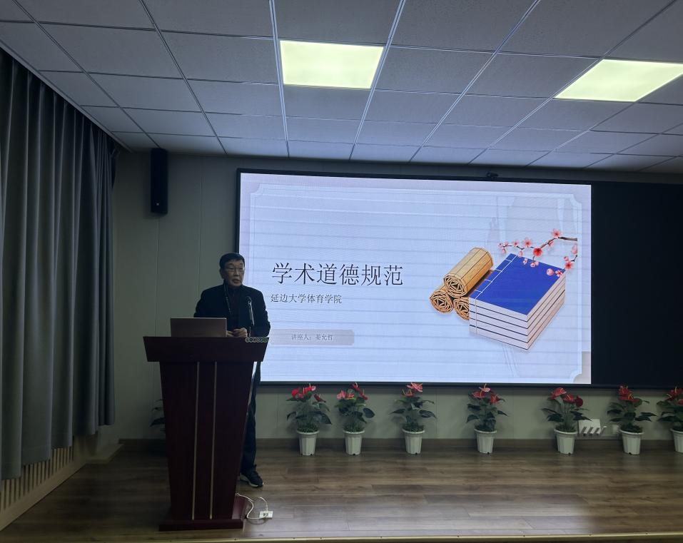 2025年11月25日上午9点,体育学院举办“严谨治学,诚信科研——学术道德规范专题讲座”,特邀我国著名体育学者、朝鲜族体育研究与运动训练领域权威专家姜允哲教授主讲。学院党委副书记安慧荣、副院长金雄哲出席,2024级、2025级研究生共同参与,以学术规范筑基,为即将到来的“第二届学术嘉年华”凝聚科研共识。